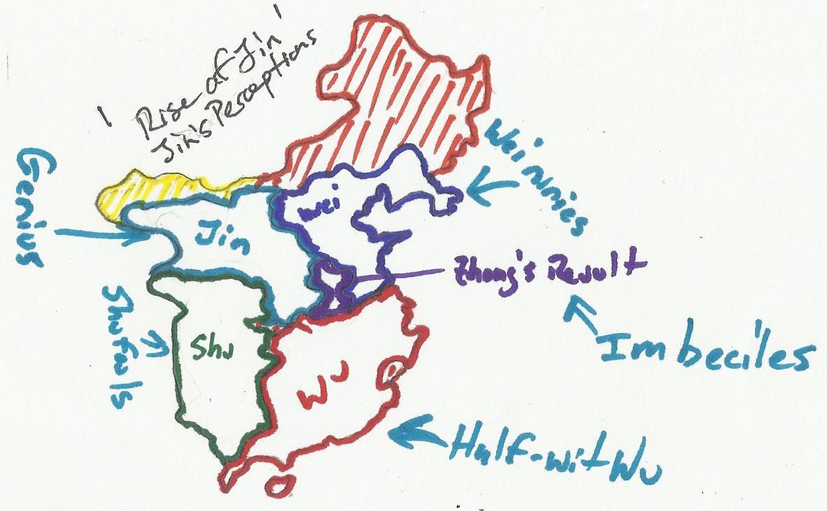 Wu gets in bed with Wei to get out of their situation after having gone against Wei years before. After the fighting that ensues Wu ceases for the most part as a key player despite remaining a large entity. Sun Quan dies and any ambition to try and sue for peace and or a real alliance between Shu and Wu have gone by the wayside. Wei and Shu both are destroyed and their remnants absorbed by the upstarts of the Jin. And Wu hope their navy and expanse will protect them from Jin. Wu still doesn’t attempt major actions against Jin up until it’s too late to do anything.