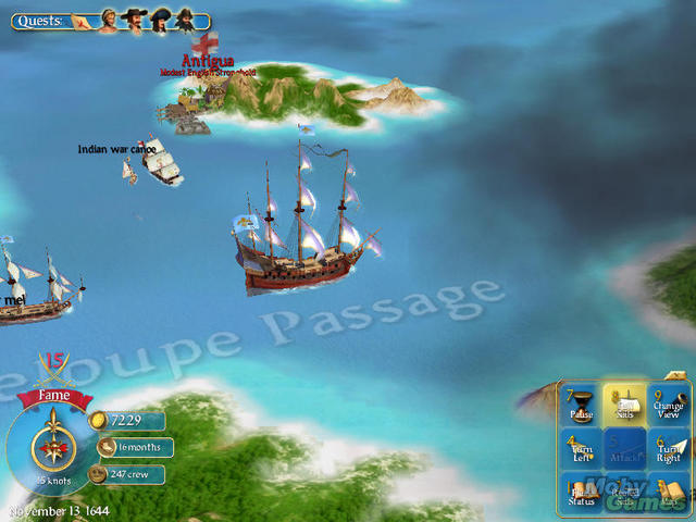 There are many types of ships you can commandeer, from small Indian Canoes to giant Ships of the Line. Each of them has an advantage and disadvantage. Usually a smaller ship means it’s faster but less guns and crew, and a bigger ship is slower but can carry more guns and crew. On lower difficulty levels you can get away with a big ship, but as you increase it and the AI gets a speed boost, you’re more than likely defaulting to a Sloop/Pinnace/Ship of the Line (if you can find one). As you travel throughout the Spanish Main, you can dance with Governor’s daughters (which will allow you to get married), buy upgrades for your ship, search for buried treasure, find lost cities of native american tribes, and so on and so forth. Of course the main quest is defeating the evil Montalban and rescuing your family. I cannot stress this enough though. Do the main storyline first. Why? Because your pirate ages. As he gets older, he can’t move as fast, and sword fights become a real bitch. Montalban doesn’t age, so the longer you take, the harder he becomes. That’s the one flaw in the game, but it’s not terribly gamebreaking.