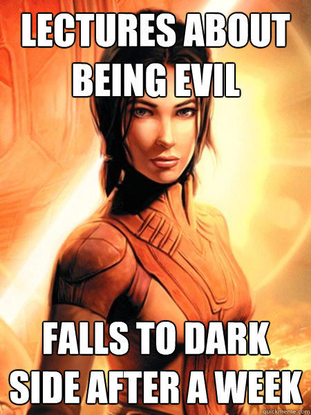 From here Bastilla notices your “strong connection” to the force. So you make a quick stop to Dantooine where you go in front of the Jedi Council and they agree to train you, despite your age, because of your visions detailing the evil Darth Revan and his apprentice Malak, plus, you know, for storyline purposes the hero(ine) shares a force bond with Bastilla. Woo. So you get trained and are sent on your first mission, to save an apprentice from the dark side. When you defeat her you get to pick your class, and then the council sends you to investigate ruins. Turns out the ruins show a piece of the map of how to get to the Star Forge, which is what Malak is searching for. So of course your mission is to now put together and find it. You travel to different planets, along the way gathering people like HK-47, a robot who hates humans and Jolee Bindo, the game’s resident Mace Windu. You also save Kashyyyk (the wookiee planet), and run into Carth’s old captain, who gives the big reveal that the player was actually Darth Revan. Most people don’t care because you’re a good guy now, but as usual, Carth has a stick up his butt and he takes the longest time to get over it. I forgot to mention that earlier, Carth is the biggest whiner about everything, especially if you do a dark side action. Anyways, so you do all that, gather the maps, and then you go to where the Star Forge is. Then you do a very boring fetch quest to prove yourself to this tribe of aliens, and you go into the temple to find where the Star Forge is. Turns out Bastilla has been tortured by Malak into being his apprentice, so Revan and her duel. Afterwards she sees how much stronger you are than Malak and tries to turn you to the dark side, even going as far to pledge her love to you.